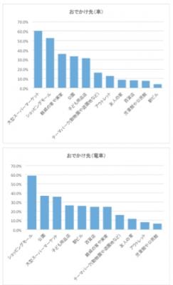 自分のタイミングで行動しやすい「車」移動によるおでかけが多く、「車」移動で人気スポットは「大型スーパーマーケット」「電車」移動での人気スポットは「ショッピングモール」「公園」といった結果になりました。以下、詳述いたします。