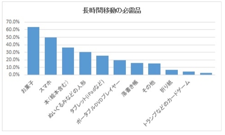 「長時間移動での必須アイテムは何ですか?」という質問をしたところ、最も多い回答が「お菓子」となりました。次いで「スマホ」という時代の特徴のように感じられる結果となりました。