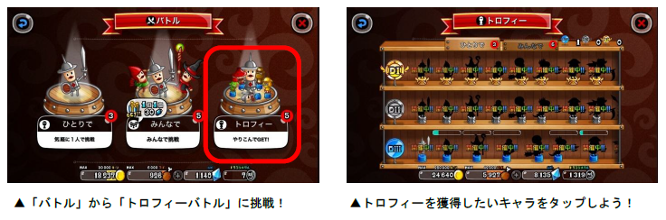 「トロフィーバトル」は、各キャラのトロフィー獲得を目指して、全国のプレイヤーとバトルを行ないます。