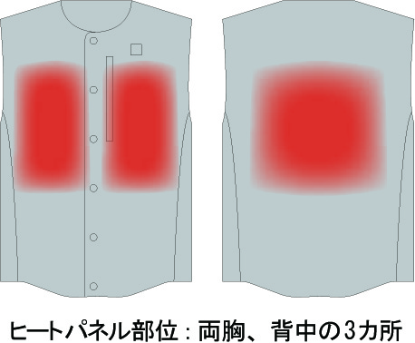ヒーターパネルを両胸、背中の3カ所に配置、体の前と後 ろから効率的に体を温めてくれます。電源を入れ約10 秒で温かさを実感ができ、胸のスイッチで電源ONとOFF、 3段階の温度調節ができるので、状況に応じてお使い頂けます。