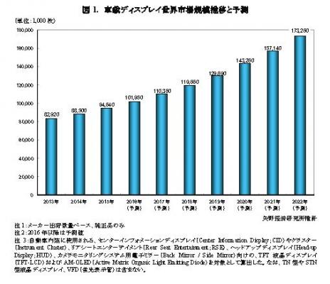 ◆2015年の車載ディスプレイ世界市場は9,464万枚、2016年は1億195万枚と予測