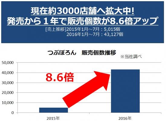 当社が2015年から発売している頑固な首元のポツポツ(※1)ケア商品「つぶぽろん」は、物理的なピーリングと、角質粒(※1)を柔軟化させ、使い続ける事で徐々にケアできる商品として、販売されました。販路拡大と共に1年で売り上げが8.6倍も伸びた事から、当社では首元のポツポツ(※1)ケア商品のニーズの高さを実感しました。