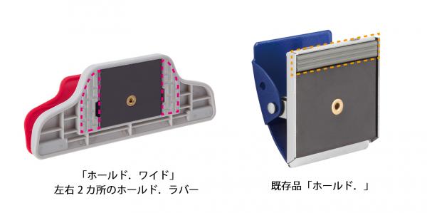 “磁石+ラバー”の組み合わせにより、“ずり落ちない”を実現したマグネットクリップ「ホールド.」から、新たにワイドタイプが登場します。ワイドな形状に加え、独自の設計を施すことで、幅広の書類を挟んでも紙の両端の垂れ下がりを防ぎ、キレイに掲示できます。またクリップを開くときの軽さや、滑りやすいホワイトボードでもしっかりキープする点など、使い勝手がさらに進化しました。最大保持枚数(A4)は約130枚※1。樹脂製でカラーは4色。メーカー希望小売価格(税抜)は600円です。