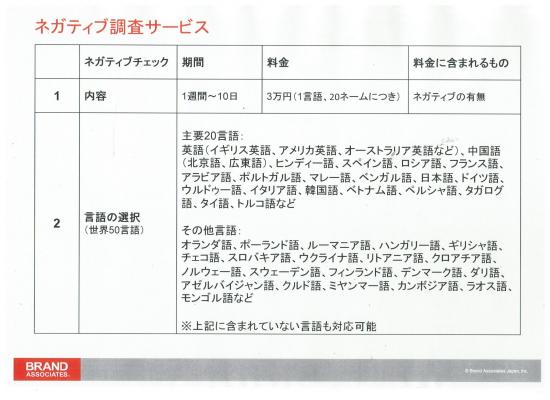 大企業から中小ベンチャー企業に至るまでブランドコンサルティングを手掛ける日本ブランドアソシエイツ(東京都港区、豊隅優CEO、http://www.brandassociates.jp)は、ビジネスのグローバル化に対応して企業の社名・商品名や社内でつくられたブランドネームを世界50言語でチェックするネガティブ調査サービスを9月15日より本格開始します。 具体的には、社名・商品名や社内でつくられたブランドネームが特定の国や地域で使用された場合、言語面でネガティブな意味やイメージを連想しないかを、ボキャブラリーの豊富な世界50言語のネイティブスピーカーによりチェックします。また、企業規模の大小にかかわらず、ネガティブな意味やイメージを連想しないブランド名であることがブランディングにおける基本でもあり、簡易チェックでもあることから、グローバル展開を目指す中小ベンチャー企業にも可能な3万円(1言語、20ネームにつき)の価格設定にしたことや、急ぎのニーズにも対応できるよう期間も1週間~10日にしたことも大きな特徴です。