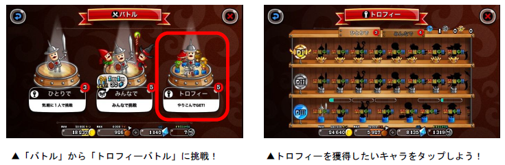「トロフィーバトル」は、各キャラのトロフィー獲得を目指して、全国のプレイヤーとバトルを行ないます。