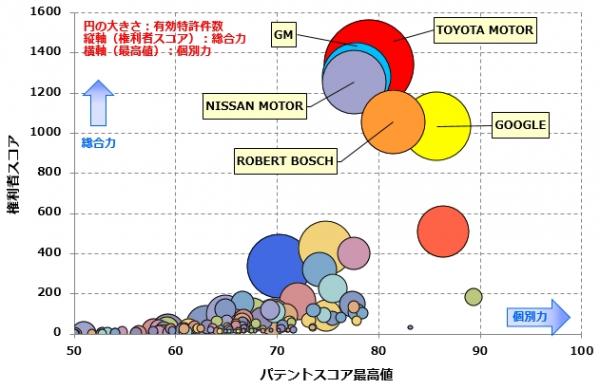 その結果、特許総合力ランキング(注1)は、1位 トヨタ自動車、2位 GM GLOBAL TECHNOLOGY OPERATIONS、3位 日産自動車となりました。