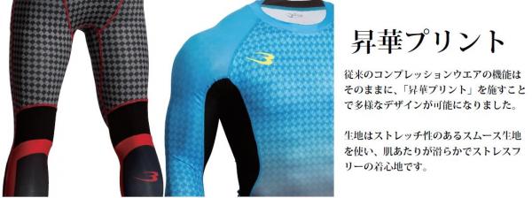 昇華プリント従来のコンプレッションウエアの機能はそのままに、「昇華プリント」を施すことで多様なデザインが可能になりました。生地はストレッチ性のあるスムース生地を使い、肌あたりが滑らかでストレスフ リーの着心地です。