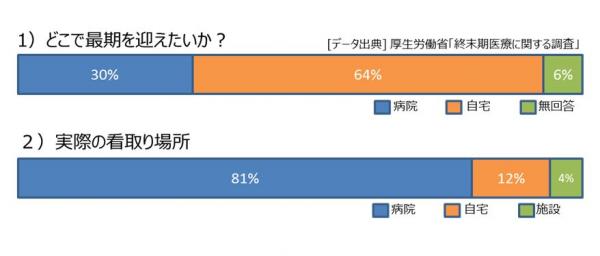 2025年から多死社会に突入し、2040年には現在の病床数では受け止めきれないと想定される年間死亡者数、看取り難民が40万人にのぼることが明らかになっていますが、「最期は自宅で迎えたい」という方が6割以上もいるのに対して、実際は病院で亡くなる方が8割というのが日本の実情です。