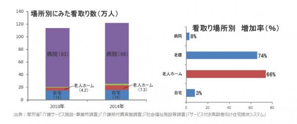 ただ、場所別にみてみると、老人ホーム・介護施設でお看取りまでされる方が近年顕著に増加しています。