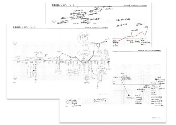 「感情曲線インタビュー」は、定性調査の「デプスインタビュー※」をベースに「感情」「時間の流れ」の軸を加え、特殊なフォーマット上への記録を行うことにより、無意識に回答していない意識・記憶も取得可能にする、IMJ独自で開発した手法です。