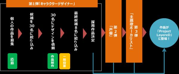 プロ・アマ問わず選ばれた30名には実際に「Project LayereD」のキャラクターデザインを依頼。その後お客様にも選考に参加、投票いただき、動画の生配信番組などで選考の模様をお伝えしながらキャラクターデザイナーを決定してまいります。