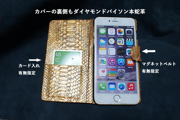中側は1枚の牛革です。外側はダイヤモンドパイソン蛇革です。牛革にスマホ・プラケースが付きます。