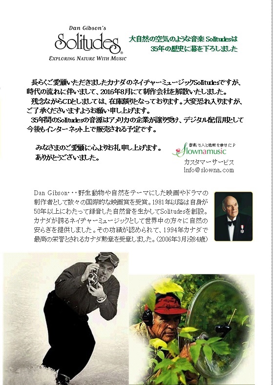 2016年8月、カナダのネイチャーミュージックレーベルDan Gibson’s『Solitudes』は、トロントの制作部門を解散することになり、世界的なネイチャーミュージックレーベルの創作活動は35年目にして終止符が打たれることとなりました。Solitudesは1981年の創設以来、世界25か国に輸出され音楽性の高い自然派のスージングサウンドとして一世を風靡しましたが、時代の流れにともない創業者が経営権を手放した後は、音楽業界の変遷とともに三度買収される運命をたどってきました。2013年には米国でインディーズレーベルのCDとDVDを扱う流通最大手Allegro Media Group の傘下に入ったものの、同社もオーディオ・ビジュアル業界がデジタル配信へ急加速するに伴い、今年6月から米国内のグループ会社を解散して事業の縮小を始め、カナダの制作部門も8月になって解散を決定、最終的にグループ全社を廃業し清算することとなりました。