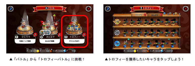 「トロフィーバトル」は、各キャラのトロフィー獲得を目指して、全国のプレイヤーとバトルを行ないます。