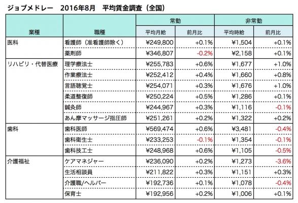 株式会社メドレー(本社:東京都港区、代表取締役社長:瀧口 浩平、代表取締役医師:豊田 剛一郎)が運営する医療介護求人サイト「ジョブメドレー」は、医療介護系15職種について、2016年8月の平均月給・時給をまとめました。