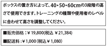 ボックスの置き方によって、40・50・60cmの3段階の高さで使用できます。トレーニングの種類や使用者のレベルに合わせて高さを調整してください。