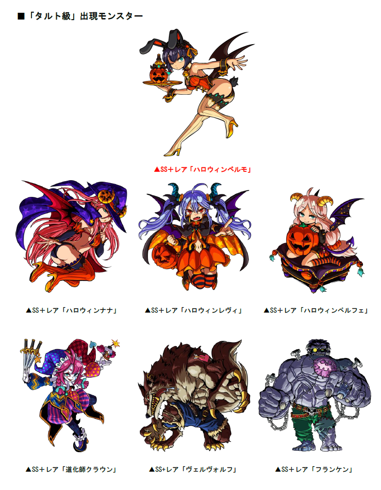 出現します。また、タルト級ではSS+レア「ハロウィンナナ」「ハロウィンレヴィ」「ハロウィンベルフェ」