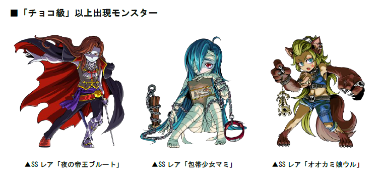「チョコ級」以上のボスモンスターとして、SSレア「夜の帝王ブルート」「包帯少女マミ」「オオカミ娘ウル」が