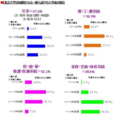 私立大に一般入試で入学した者は全体の半数未満。系統別では、理・工・農系統の学部は56.5%、文系学部は47.2%などと、文系・理系で対照的な結果になりました。