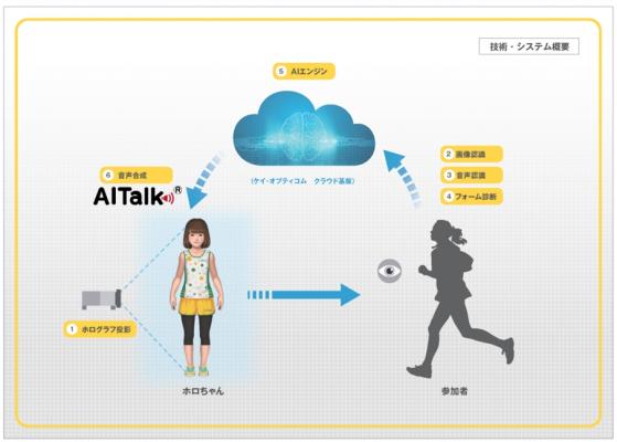 HOLOGRUNは、ホログラフ技術にて立体投影された身長130cm程度の女の子のキャラクター「ホロちゃん」との会話を中心とした企画です。体験者の方はホロちゃんとの会話やランニングフォームの診断を受けることができます。ホロちゃんの技術には、ホログラフ投影、画像認識、音声認識、ランニングフォームの分析、ランニングフォームの分析、AIエンジン、音声合成の分野における高い技術力を保有する各社が協業して実施します。