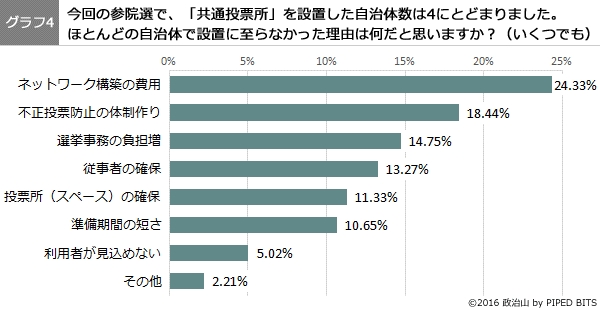 「共通投票所の設置」(以下、設置)がほとんどの自治体で実現しなかった理由について問うと、「ネットワーク構築の費用」24.33%がもっとも多く、「不正投票防止の体制作り」18.44%、「選挙事務の負担増」14.75%、「従事者の確保」13.27%と続いています。