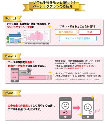 『女性のリズム手帳』は、生理サイクルを記録することで次回の生理日や妊娠しやすい/しにくい時期を予測したり、基礎体温・体重・体脂肪率の毎日の記録・管理をサポートする、人気の女性向け無料ヘルスケアアプリです。今般、新たに提供開始する「ベーシックプラン」は、(1)基礎体温、体重、体脂肪率をグラフ化したデータを、全国のコンビニエンスストアでプリント (2)無料版では30日間に限られていたデータ保存期間を、無期限で自動保存 (3)無料版の広告を非表示 の3つの機能をサポートします。