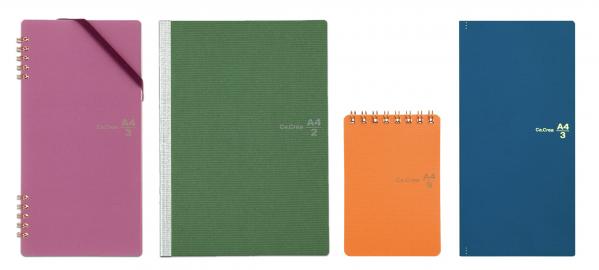 ユーザーの好みに合わせ、「A4×1/3サイズ」を皮切りに、持ち運びやすさにこだわった「ツインリング A4×1/3サイズ」、大きく書いて小さく持てる「A4×1/2サイズ」、胸ポケットにいれて携帯できる「ツインリング A4×1/9サイズ」などが揃っています。ハイグレードな表紙と万年筆でも裏抜けしにくい滑らかな中紙を採用した「プレミアムクロス A4×1/3サイズ」(2015年11月発売)は第25回日本文具大賞を受賞しました。