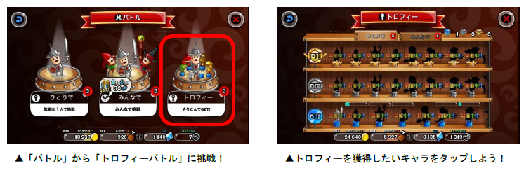 各キャラのトロフィー獲得を目指して、全国のプレイヤーとバトルを行う「トロフィーバトル」を