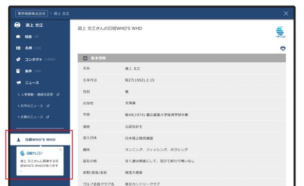 氏名をクリックして人物マスタを開くと、そこから日経WHO’S WHOの情報を確認することができます。