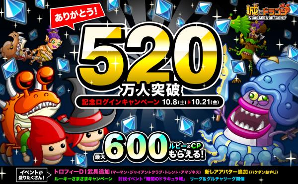 ログインするだけでルビー・CPが手に入る「520万人突破記念ログインキャンペーン」を開催いたします。