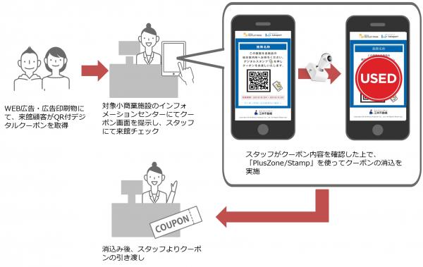 三井不動産商業マネジメントでは、顧客対応サービスの向上を推進しており、この度クーポンを持参し来館する顧客へのよりスムーズな対応を行なうために、スマートフォンで完結できる電子スタンプ「PlusZone/Stamp」が採用されました。