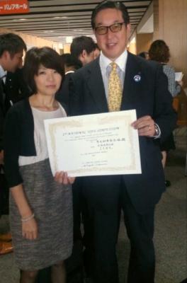 <アメリカ大豆アンバサダーアワードの賞状を持つ、食品大豆業界で知らない人はいない!さとの雪食品常務取締役 村尾誠さんとUSSEC立石雅子>