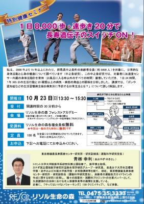 都心から約75分の千葉県の中央「中房総」に広がる、多世代交流型リゾートコミュニティ「リソル生命の森」(千葉県長柄町)では、“いきがい・絆・健康・くつろぎ”をテーマとした各種講座「お茶の間ゼミ」を連続開催しております。この10月23日(日)には、講師に青栁幸利(あおやぎ ゆきとし)氏をお迎えして新聞や書籍などマスコミでも話題の「ガンや糖尿病、認知症などの生活習慣病全般を病気別に予防する歩数と歩き方」といったテーマで特別健康セミナー「1日8,000歩・速歩き20分で長寿遺伝子のスイッチON!」(聴講無料)を予定しています。