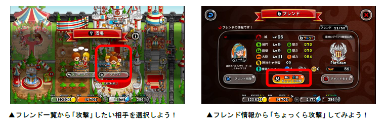 レアアイテム獲得を目指してバトルに挑みましょう!また、フレンドへの「ちょっくら攻撃」で獲得できる