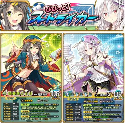 期間限定イベントクエスト「びびっど!ストライカー」でスコアを集め、限定UR「詩奏音 ことば(うたかね ことば)」(CV:荒浪 和沙)をゲットしよう!一定確率で出現するレアアイテムを獲得するとスコア大量獲得クエストが出現!フィーバータイムでスコア大量獲得! さらに、期間限定イベントのデイリーランキング上位者は限定UR「上下上 下上(かみかがみ かがみ)」(CV:上原 あかり)もゲットできます!