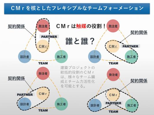 従来の建設プロジェクトチームの中にCMrという『触媒の役割』を加えることで、プロジェクトの受注機会を広げ、より効率的な業務推進体制を構築します。本サービスが、従来のプロジェクトチームの枠組み(フォーメーション)にフレキシビリティを与え、国内建設業界のイノベーションを生み出す新しいシステムになることを目指しています。
