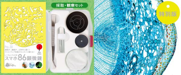 「特別版」は、従来のセット(照明コントロールボード、ディフューザー、小型シャーレ、ピンセット、円型スライドガラス ほか)に、86用ボールレンズ+1個と植物細胞・微生物写真ポストカード12枚が付いて同額価格の3,200円(税抜)。