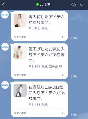 現在ルミネは「WEBCAS taLk」を、主に“ネット通販「アイルミネ」会員の利用状況に応じたメッセージの自動通知”、具体的には、完売商品の再入荷を希望者に知らせる「再入荷通知」、お気に入りアイテムの「値下げ通知」、「在庫残り1点通知」の配信に活用しています。