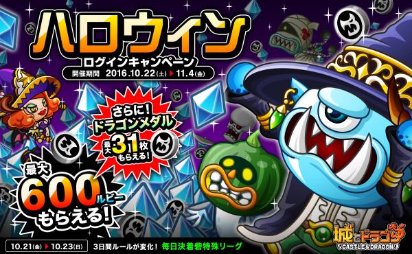 10月22日(土)より、ログインするだけでルビーやドラゴンメダルが手に入る「ハロウィンログイン