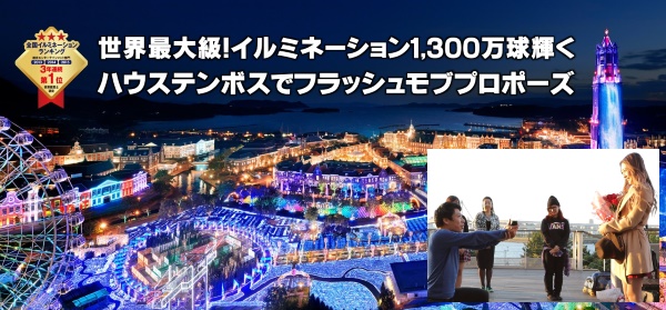 3年連続イルミネーション全国第1位のハウステンボス内で一般人などに変装したダンサーがいきなり踊りだし、終盤で彼氏さんもダンスに加わりそして最後にプロポーズ。