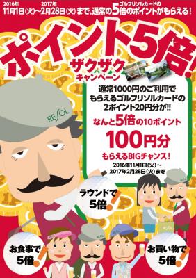 多世代交流型コミュニティを幹としてゴルフ、ホテル、ライフサポート、リゾートライフを枝とするツリー型事業を展開しているリソルグループ(本社・東京都新宿区)が全国で運営する各ゴルフ場では、皆様の快適なゴルフを応援する「ゴルフリソルカード」会員様に向けて、2016年11月1日~2017年2月28日まで「ポイント5倍!ザクザクキャンペーン」を開催します。