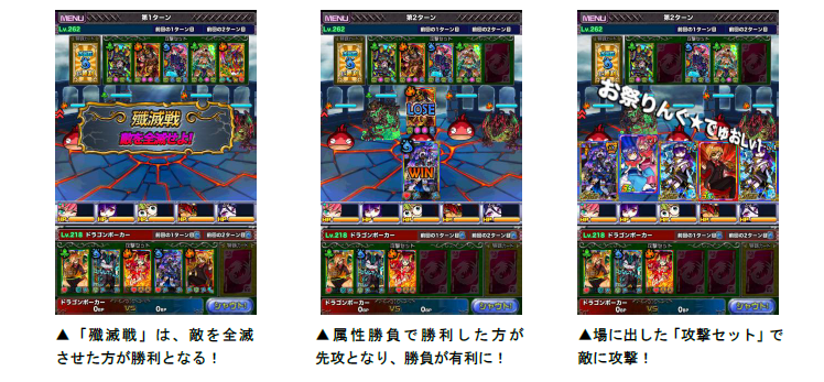 デュエルマッチは、3ターンで1戦が完結し、1vs1で遊べるリアルタイム対人バトルです。バトルには「殲滅戦」