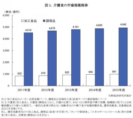 ◆ 2015年度の介護食市場規模は加工食品が991億円、調理品が4,942億円
