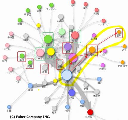 対象キーワードを入力すると、周囲に複合キーワードが配置され、自動で色分けされるので、視覚的にユーザーの検索意図を把握しやすくなります。たとえば「民泊 東京」などと、検索した単語の順番が矢印の向き、セットで検索された回数の多さが円の大きさや矢印の太さで表示されます。