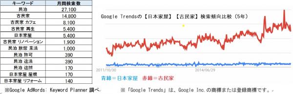 「日本家屋」の検索傾向は過去5年あまり変化がないのに対し、「古民家」は検索される傾向が年々強くなっていることがわかります。さらに、月間検索数は「古民家(14,800)」「日本家屋(5,400)」となっており、約2.5倍のニーズが「古民家」にあることがわかります(Google AdWords: Keyword Planner調べ)。