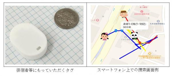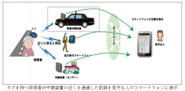 徘徊の可能性のある人にタグを装着してもらい、一方で地区一帯の店舗等に設置する中継装置、地区の協力者が持つスマートフォン、そして今回導入するタクシーに搭載する中継装置のいずれかでタグの通過を検出し、見守る人のスマートフォンに表示します。