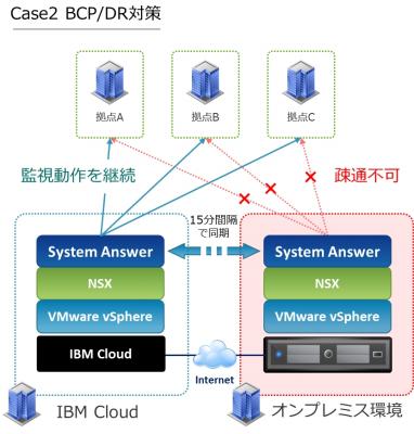 万が一、稼働中のSystem Answer が外部から通信不可となった場合であっても、VMware(ヴイエムウェア)によって複数ロケーションに同期させることで、System Answer の設定変更なしで監視を継続させることができます。