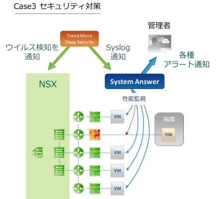 Deep Securityによる脅威の検知やVMwareでの隔離動作を、Syslog(シスログ)連携により時系列で把握し、System Answer からバーチャルマシーンに対しての監視がタイムアウトしたことを検知することによって、隔離動作の正常完了を確認することができます。