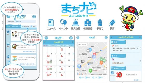 情報配信プラットフォーム『まちナビ』は、学校・保育・災害・ゴミ分別など町から住民への生活情報の配信に加えて、住民から選ばれた「まち記者」が住民目線で捉えた地域密着型のニュースを発信できるしくみとなっており、住民参加型の情報共有を実現します。また、「プライベートの予定や地域イベントを管理できるカレンダー」、「町内施設への簡単ルート検索機能付きのマップ」などの便利機能も備えています。
