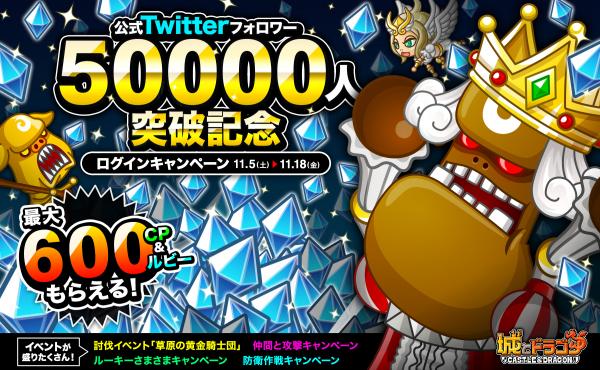 11月5日(土)より、『城とドラゴン』公式Twitterのフォロワーが50000人を突破したことを記念して、